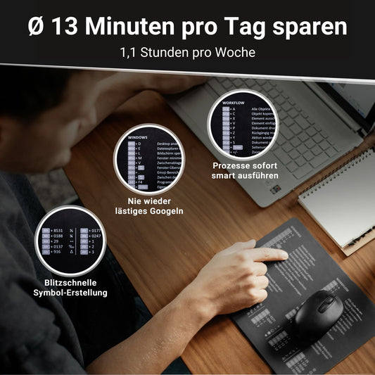 Die wichtigsten Tastatur-Kombinationen auf einen Blick - auf hochwertigem Öko-Leder. Statt lange zu googeln wie noch einmal ein Screenshot funktioniert oder du einen Seitenumbruch in Word erstellst, schau einfach kurz auf dein stilvolles LISTENWISSEN Mousepad. Das Beste: Nach einigen Wochen kannst du die Shortcuts dann sogar aus dem Kopf.