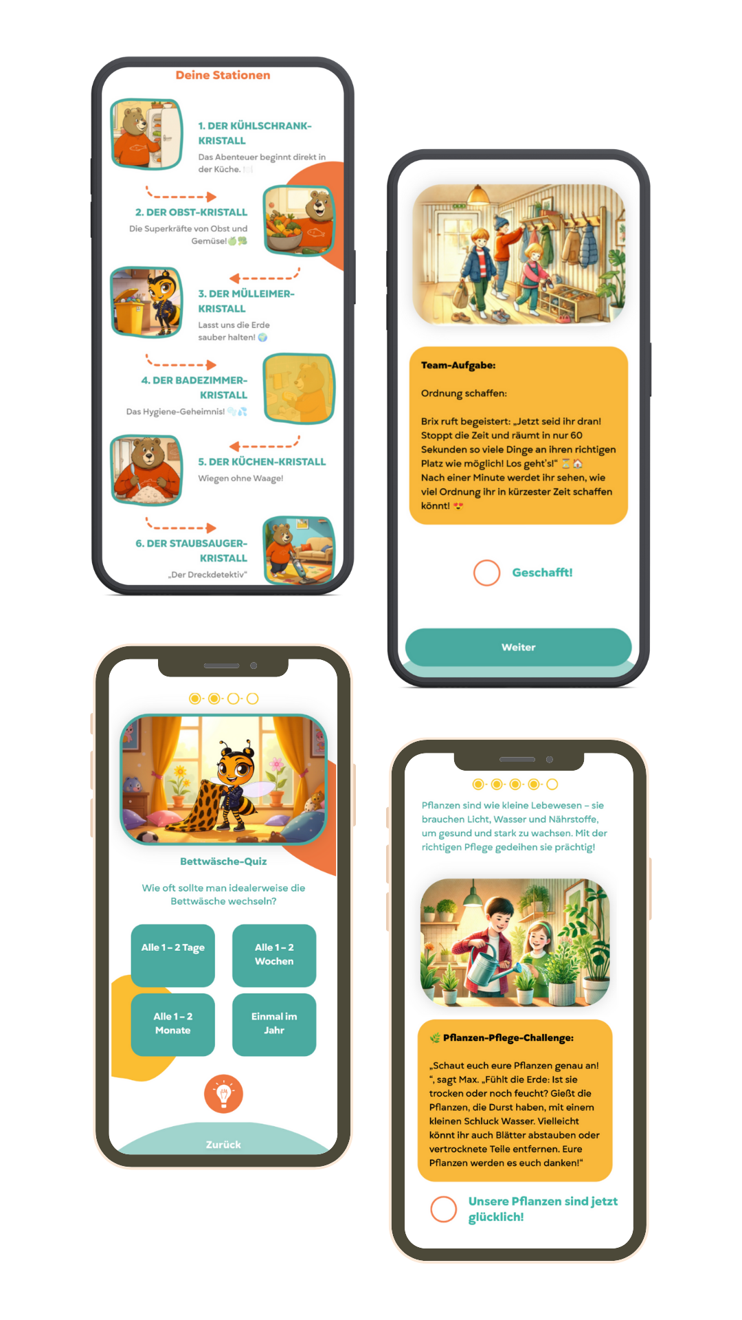 Gemeinsam mit Max und Brix erkundet ihr spielerisch euren Haushalt, löst kleine Aufgaben und sammelt dabei Haushalts-Kristalle, um euer Zuhause wieder in Ordnung zu bringen.